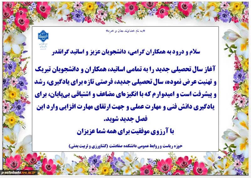 امتیاز دهید : پیام تبریک شروع سال تحصیلی جدید به تمامی اساتید، همکاران و دانشجویان گرامی 2 یکشنبه 30 شهریور 1404 ساعت 10:28